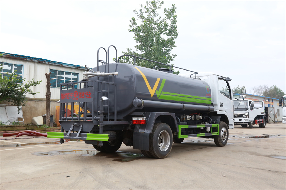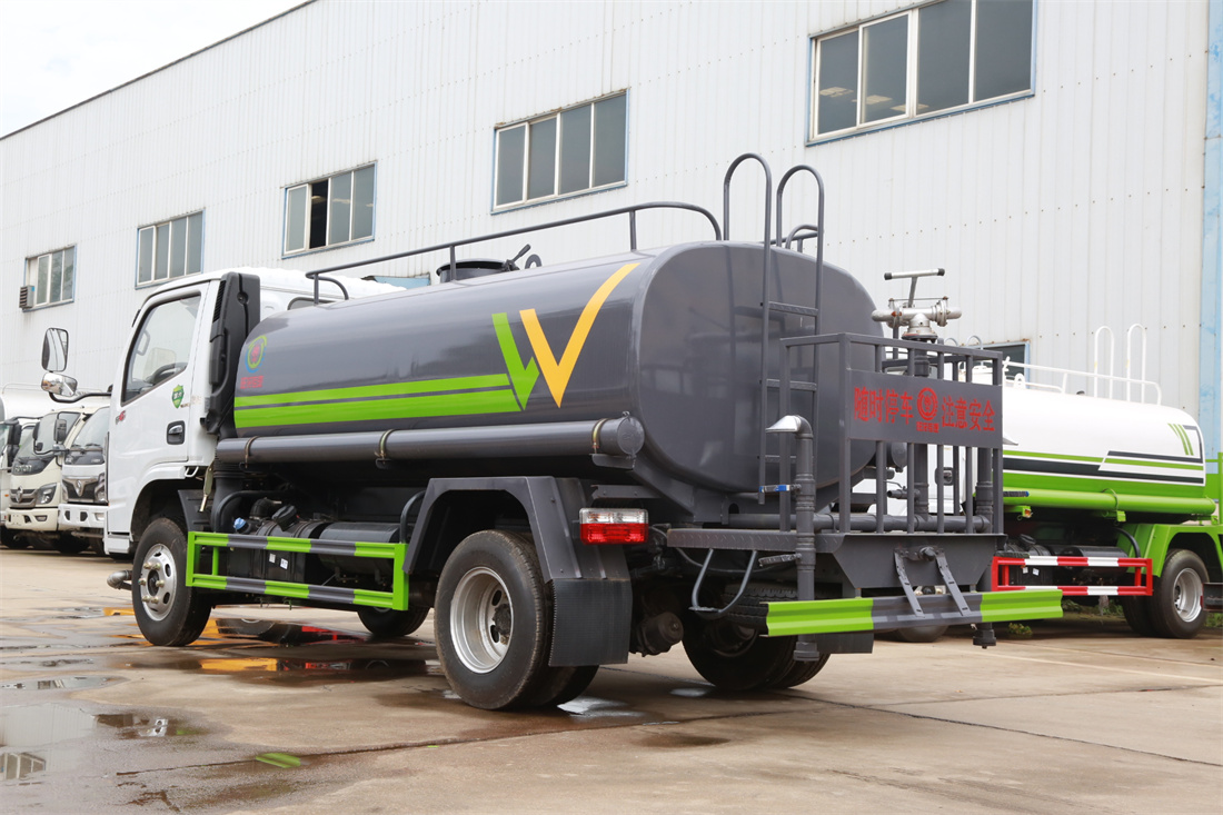 灑水車前裝有鴨形噴嘴或圓頭沖嘴,后面裝有圓柱開灑水噴嘴或蓮蓬頭噴嘴,后部有一工作平臺(tái),裝配有水炮。后部還可裝8個(gè)噴嘴(選裝)。