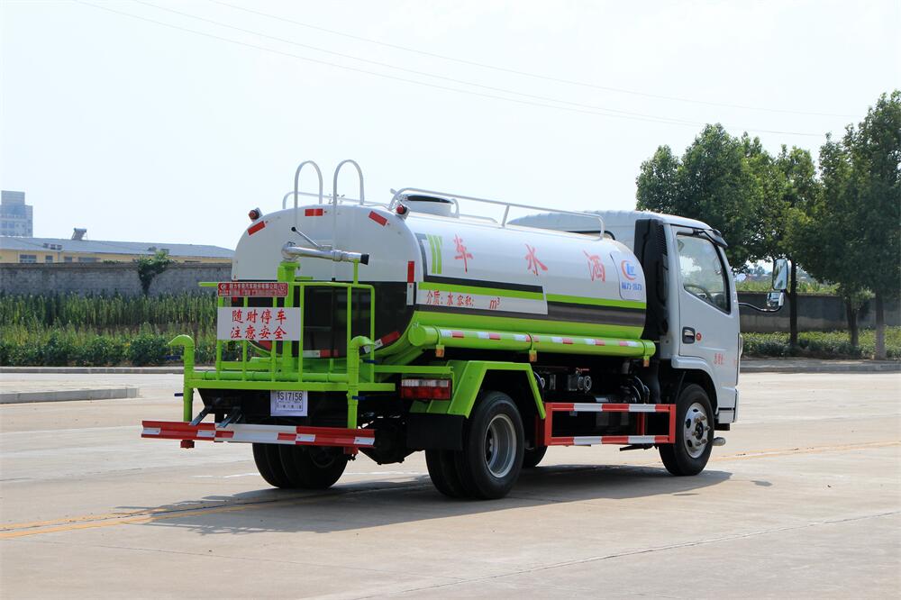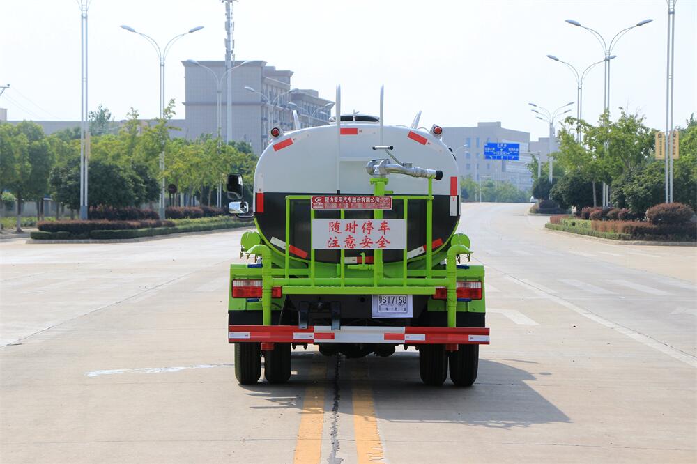 灑水車(chē)前裝有鴨形噴嘴或圓頭沖嘴,后面裝有圓柱開(kāi)灑水噴嘴或蓮蓬頭噴嘴,后部有一工作平臺(tái),裝配有水炮。后部還可裝8個(gè)噴嘴(選裝)。