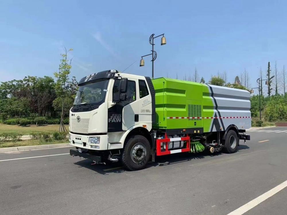 高效洗掃車利用高壓水流及傾斜掃刷將垃圾掃**吸盤前面,在風機產生的負壓作業下,風流在閉合的回路中將垃圾吸入垃圾箱中貯存,整個作業過程均是物理原理,不會產生化學廢料或垃圾外泄對環境的二次污染,同時,后噴霧的降塵有效的降低了空氣中粉塵濃度,解決粉塵污染問題。