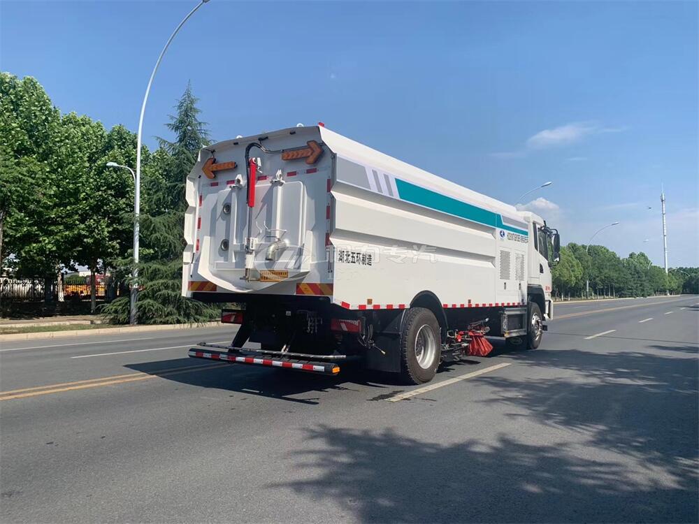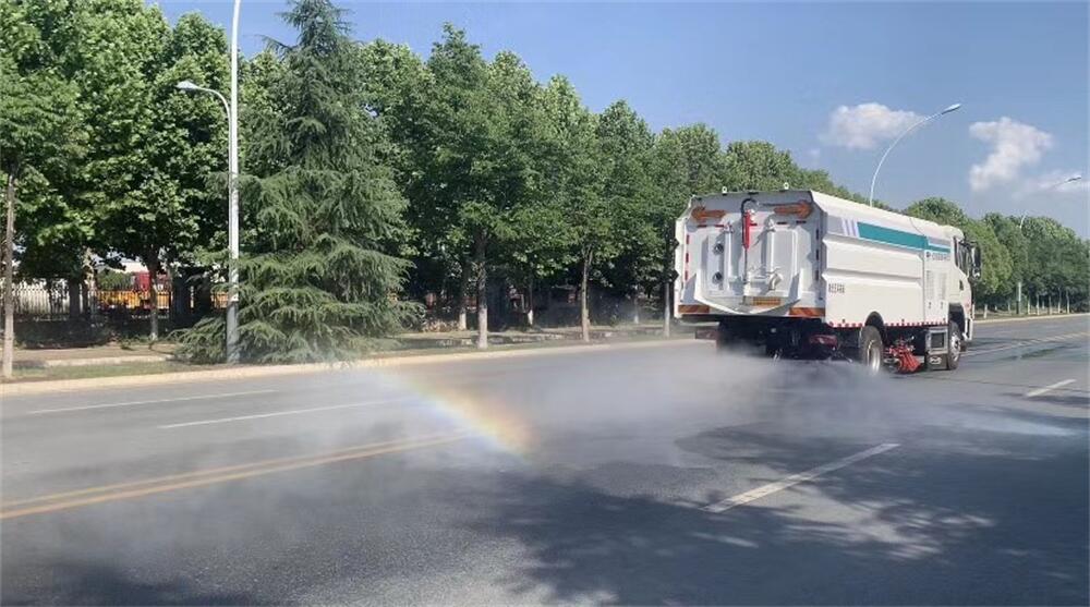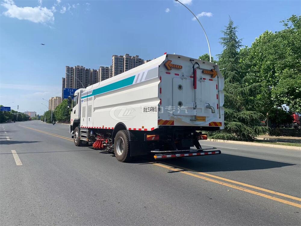 1)該車集掃路車和高壓清洗車功能于一體,具備路面清掃、路面洗刷、高壓清洗、路緣石洗刷、垃圾收集、污水回收、噴霧降塵和道路隔離墻清洗、小廣告清洗等多種作業(yè)功能。