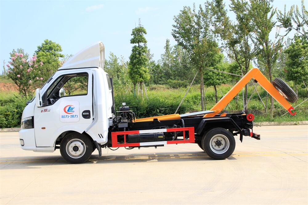 該款鉤臂式垃圾車由液壓系統、操作系統組成。舉升油制缸(1支)系國內知名液壓件廠家生產的雙作用油缸。垃圾廂可自吊上放下,可自行傾倒垃圾,上下一次工作循環時間≤50S。該車的特點是一個車能配多個垃圾廂,能實現一臺車與多個垃圾廂聯合作業,循環運輸,充分提高了車輛的運輸能力。