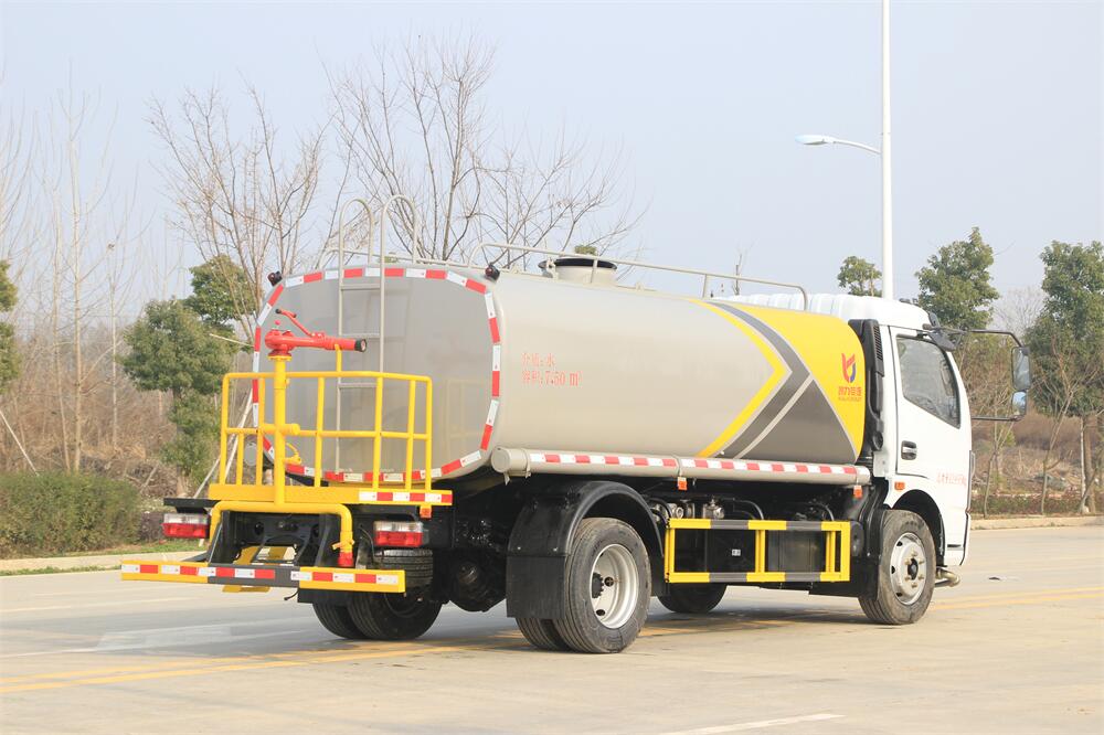 灑水車(chē)前裝有鴨形噴嘴或圓頭沖嘴,后面裝有圓柱開(kāi)灑水噴嘴或蓮蓬頭噴嘴,后部有一工作平臺(tái),裝配有水炮。后部還可裝8個(gè)噴嘴(選裝)。