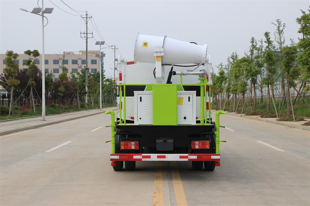 上裝配置:罐體容積為 5立方,選配風送式霧炮機組射程30米、40米、50米、60米、80米、100米、120米霧炮,罐體鋼板為4mm碳鋼Q235材質,罐內隔板具有防波作用,以減輕汽車行駛時罐體液體沖擊,罐體及整車外形尺寸按照公告。帶大功率專用灑水泵,泵可自吸自排,整車前沖、后灑、側噴、帶65消防接口,后平臺配CLW-50、CLW-60、CLW-80、CLW-100、CLW-120型風送式霧炮機組;罐體前封頭配大功率柴油發電機組;前封頭帶水位計,后平臺主管路帶1寸澆花接口,后爬梯。帶兩根輸水管及陰陽端。罐體顏色:銀/灰/綠,罐體兩側噴“多功能抑塵車”字樣,貼反光標示。