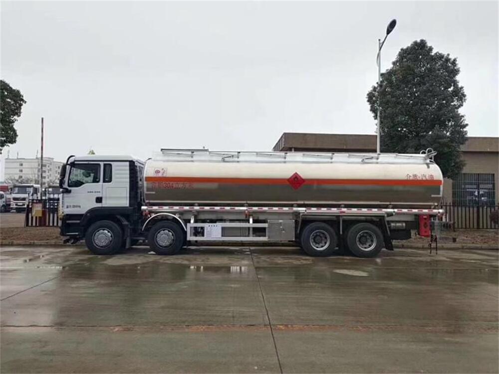 2.上裝配置:上裝采用國標(biāo)5083鋁合金板材,公告容積30.4(實際有效容積約32立方),標(biāo)配單倉,帶泵進(jìn)泵出,標(biāo)配兩個歐標(biāo)罐蓋和緊急切斷閥,帶歐標(biāo)全套下裝油系統(tǒng)(含下裝卸油閥、防溢流裝置和油氣回收裝置等),罐體頂部兩側(cè)帶折疊式升降防護(hù)欄,隨車配送兩根卸料軟管、陰陽端接頭、下裝油口轉(zhuǎn)換接頭等,其余均為廠家標(biāo)配。罐體油漆為銀粉色金屬漆,兩側(cè)及后封頭水平正中貼3M-1級橙色反光帶,反光板,貼“易燃液體”標(biāo)識,貼安全告示牌。