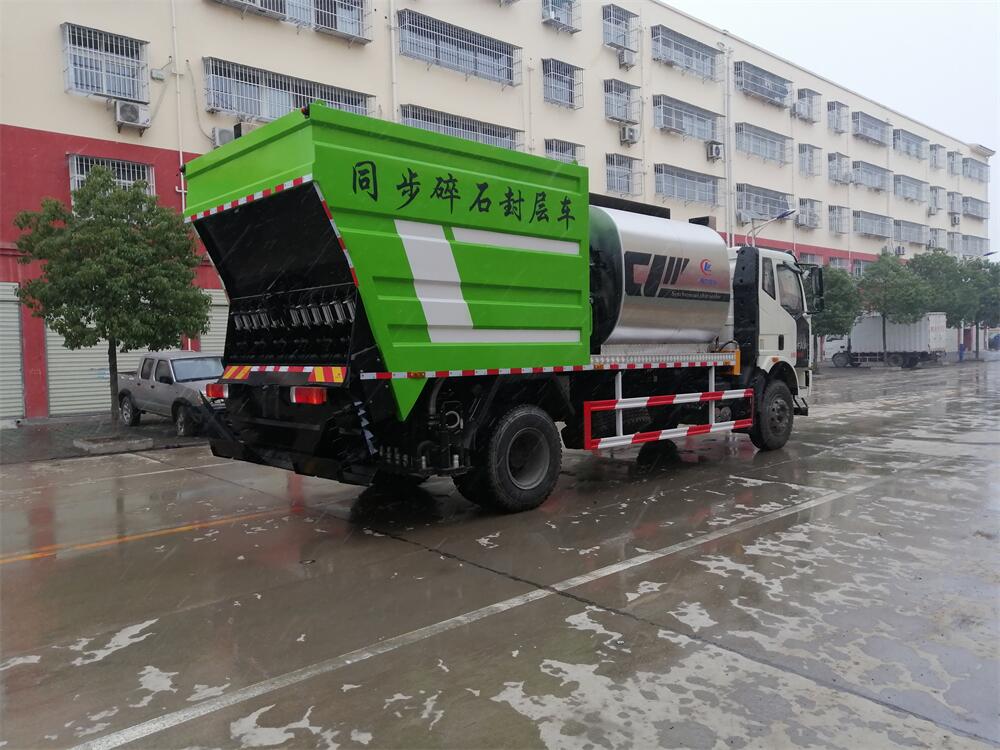 4、后雙橋同步碎石封層車完全采用電氣**,自動化程度高,,能**的計算出設備在施工過程中瀝青噴灑量和石屑撒布量的多少;