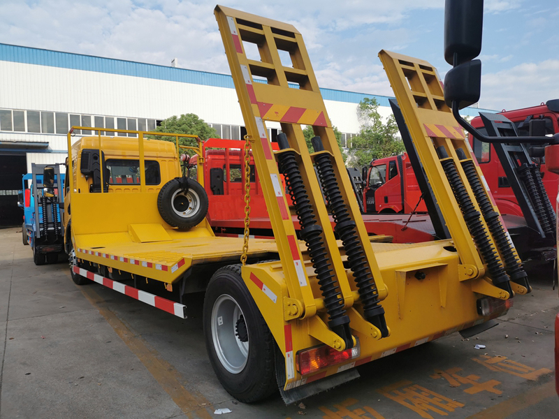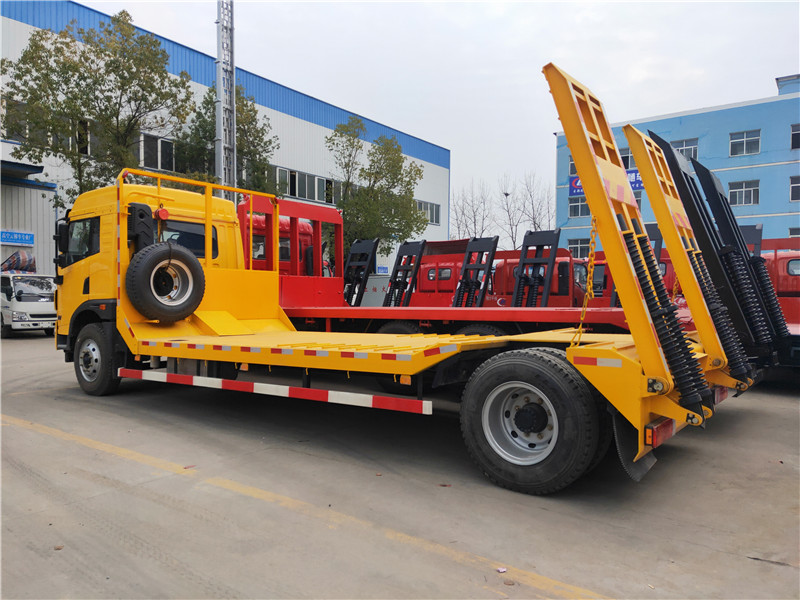 解放凹板單橋平板運輸車 解放駕駛室 排放:國五新規 發動機:錫柴4缸180馬力 變速箱:伊頓6檔變速箱 前后橋:145加強后橋 軸距:6.45米 輪胎:825-20鋼絲胎 大梁: 250雙大梁 整車對應尺寸:7800*2550*2970 車型亮點:ABS防抱死系統 . 剎車間隙自動調整臂、防飛濺、前下防護,北斗,GPRS行車記錄儀,國產ABS,電動門窗,空氣彈簧座椅,空調。可拉15噸以下挖機等設備。此產品**大的優勢是離地低,離地僅90公分,更容易通過。 上裝采用五毫米花紋鋼板,整體凹梁設計,加強雙簧爬梯,可拉15噸以下挖機。 可選裝配置:液壓全自動爬梯,折疊型加長型液壓全自動爬梯,可加裝兩邊伸展,一邊可伸縮30公分。